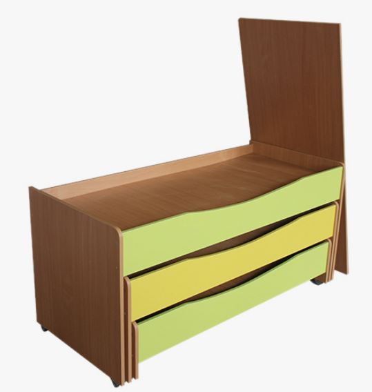 Кромка ПВХ 0,4 мм. и 2 мм.Спинки со скругленными углами, вторая и третья кровать со ступором, чтобы не выкатывались бесконтрольно. Между царгами кроватей 8 дополнительных планок для усиления, на которые кладется ДВП для матраса. Кровать доукомплектована крышкой.