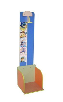 Размеры 42*42*150 см. Стойка из цветного ЛДСП, внизу площадка с бортиками, со стороны стены - двойная панель из ЛДСП с наклейкой и указанием сантиметров, посередине, в отверстии бегунок с горизонтальной планкой для измерения роста, в самом верху двойной панели - ограничитель фигурной формы.