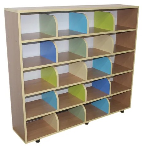 Описание: Основной цвет бук или кремовый, фасады цветные по желанию заказчика. Тумба разделена на 20 одинаковых ячеек. Четыре горизонтальные полки делят тумбу на 5 равных частей в высоту, по ширине - вертикальные перегородки делят каждую полку на 4 равные ячейки.