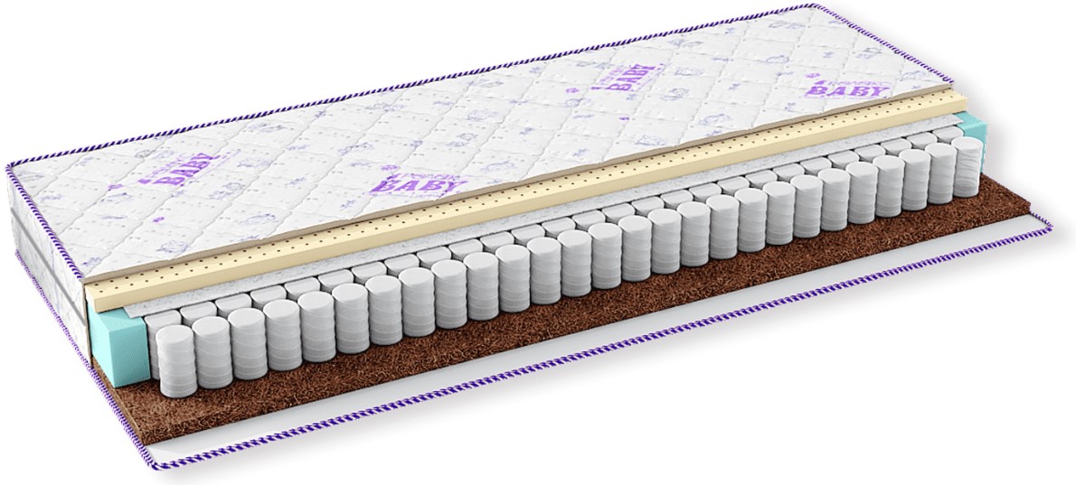 Размеры 800*1900*140 мм, съемный чехол из хлопкового жаккарда, стеганого на синтепоне, ватин, 2 слоя, натуральное кокосовое волокно, 10мм, термовойлок, пружинная система "Pocket Spring Kids", 120мм, термовойлок, натуральное кокосовое волокно, 10мм, ватин, 2 слоя, пенополиуретан по периметру