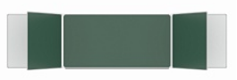 2ой и 3ий элементы: боковые двухсторонние створки для мела и для маркера – по 85 см каждая, могут независимо открываться и закрываться от плоскости основной части доски до плоскости стены.