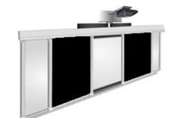 Слева и справа от интерактивной доски стационарно в стену крепятся две аудиторные доски. Еще две аудиторные доски крепятся в направляющий верхний профиль через систему кареток и имеют свободный ход. При необходимости преподаватель может закрыть, сдвинув их к центру, либо раздвинуть их.