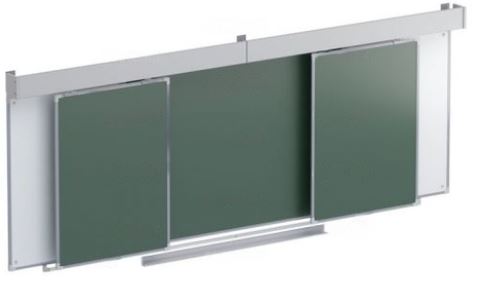Раздвижная система досок состоит из неподвижно закреплённых на стене двух боковых аудиторных досок белого цвета,меловой доски по центру, и двух подвижных аудиторных досок на кронштейнах, зеленого цвета.