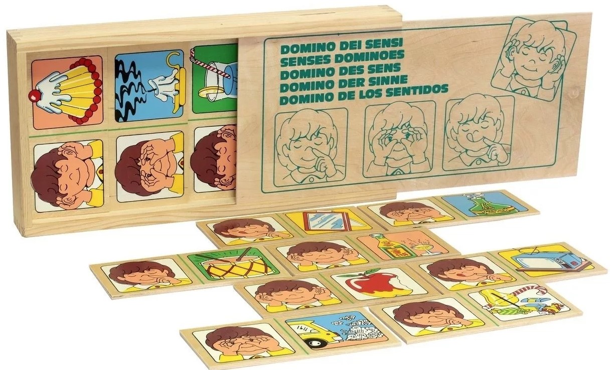 Настольная игра "Органы чувств" включает 20 деревянных прямоугольных карточек и деревянную коробку. Каждая карточка с изображением двух картинок - на первой мальчик руками указывает на лице органы чувств, а на второй - причина того или иного чувства в виде предмета, еды, явлений.