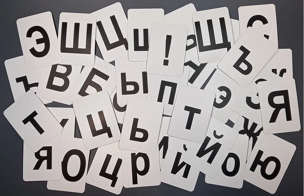 Карточки с буквами и знаками на белом фоне - 144 шт
