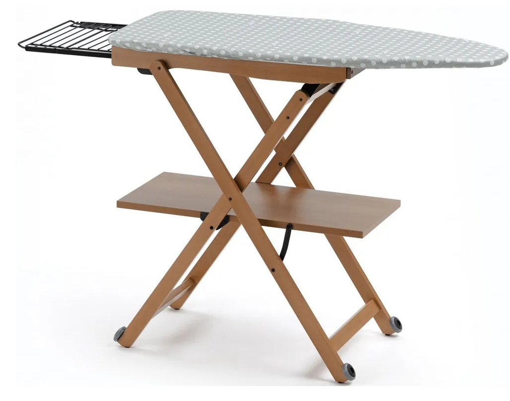 Каркас изделия выполнен из высококачественной древесины бука, рабочая поверхность сделана из оцинкованной стали и покрыта натуральным хлопком. Для вашего удобства она снабжена вместительной полкой для вещей и выдвигающейся подставкой для утюга.